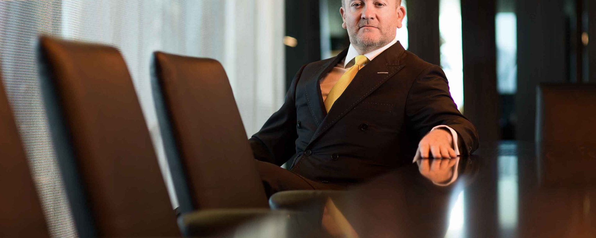 I liked the way the silver wire mesh curtain on his right softened the natural sunlight and added contrast to an otherwise dark interior. I wanted to use the length of the beautiful boardroom table and it’s reflective quality as creative elements to scene. The narrow depth of field at f2.8 really support the long table length and the background blur diffuses the light/dark contrast directly behind him. Jan’s reflection almost doubles his power presence and the strips of white ambient light behind him really cut through the image nicely. The warm orange glow of the overhead lamps really soften the dark table foreground so that the eye leads gently into Jan.