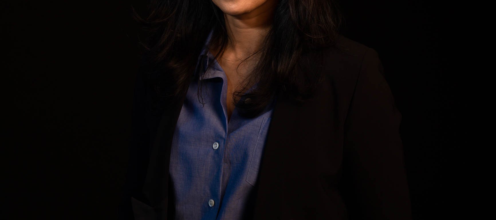 I used a Profoto 1×6 strip box with a mask as a fill light for the right side of her body. Under her black suit, she wore a blue shirt and the strip light bought out the smallest detail of the shirt and cuff. This also separated her from the plain black background. This was metered at f5.6 (2 stops below key).