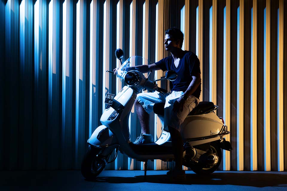This is a quick 2 light portrait in Jakarta around 5.30pm. However, I wanted to recreate a moody night shot of my subject sitting on the vespa surrounded by harsh street lighting. So to achieve this, I simply played with my camera shutter speed, white balance and gels.